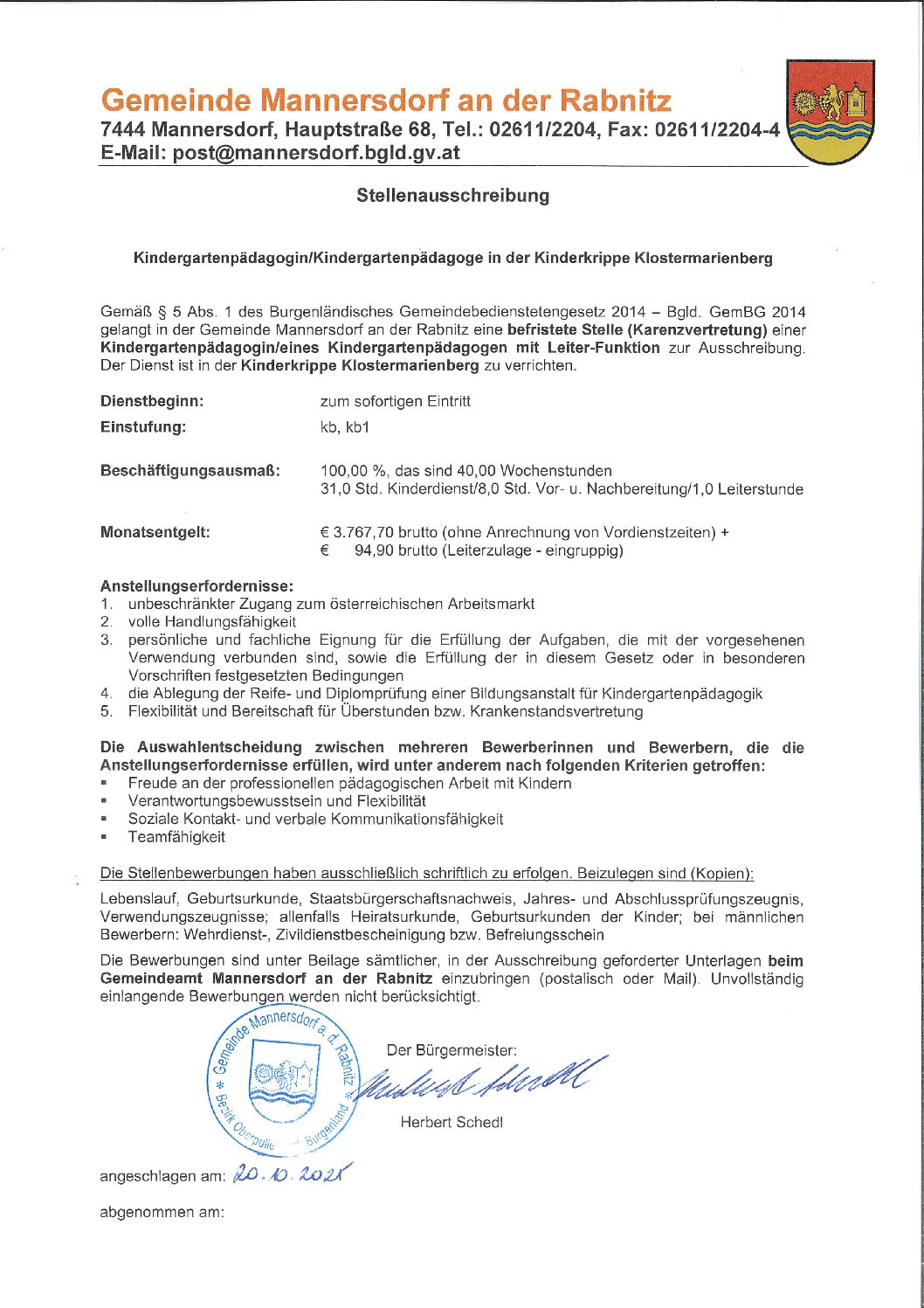 Stellenausschreibung! Kindergartenpädagogin / Kindergartenpädagoge in der Kinderkrippe Klostermarienberg! von Heribert | 23. Okt. 2025 | Stellenausschreibungen | 0 Kommentare Kindergartenpädagogin/Kindergartenpädagoge in der Kinderkrippe Klostermarienberg! Klicken sie hier!